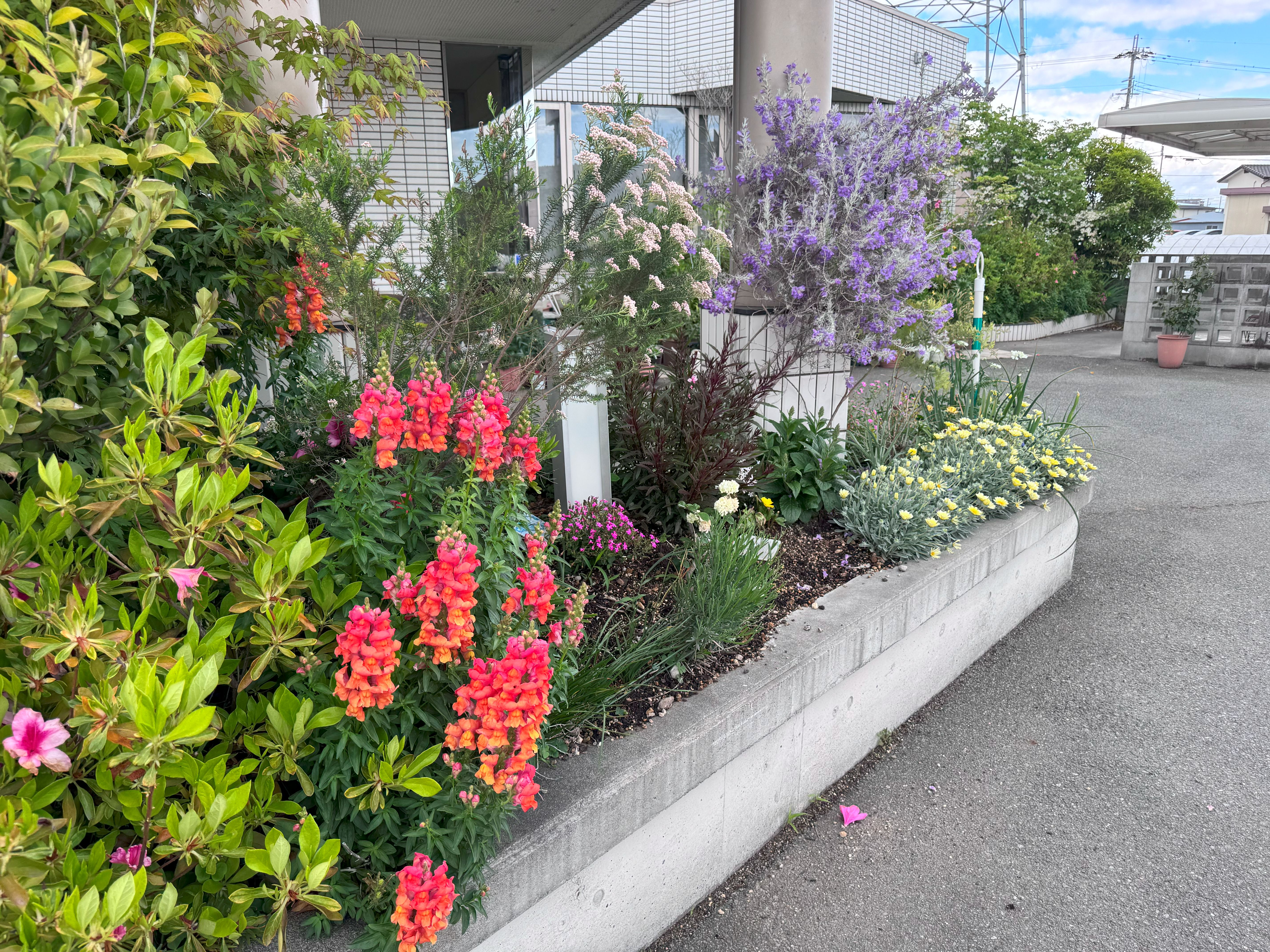手前のオレンジがキンギョソウ、白いツブツブがライスフラワー、奥の藤色はエレモフィラです