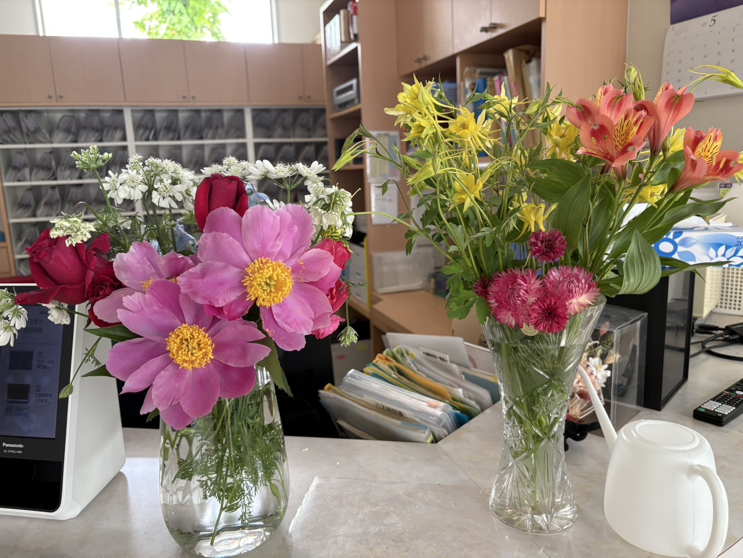 濃いピンクのシャクヤクと赤いバラが主役です。脇役の花も庭で育てました🌷