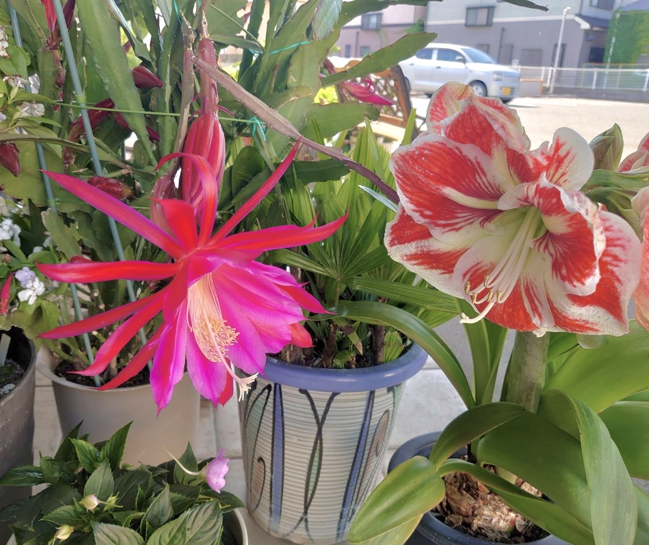 右スーパージャイアントアマリリス、左クジャクサボテン咲きました
