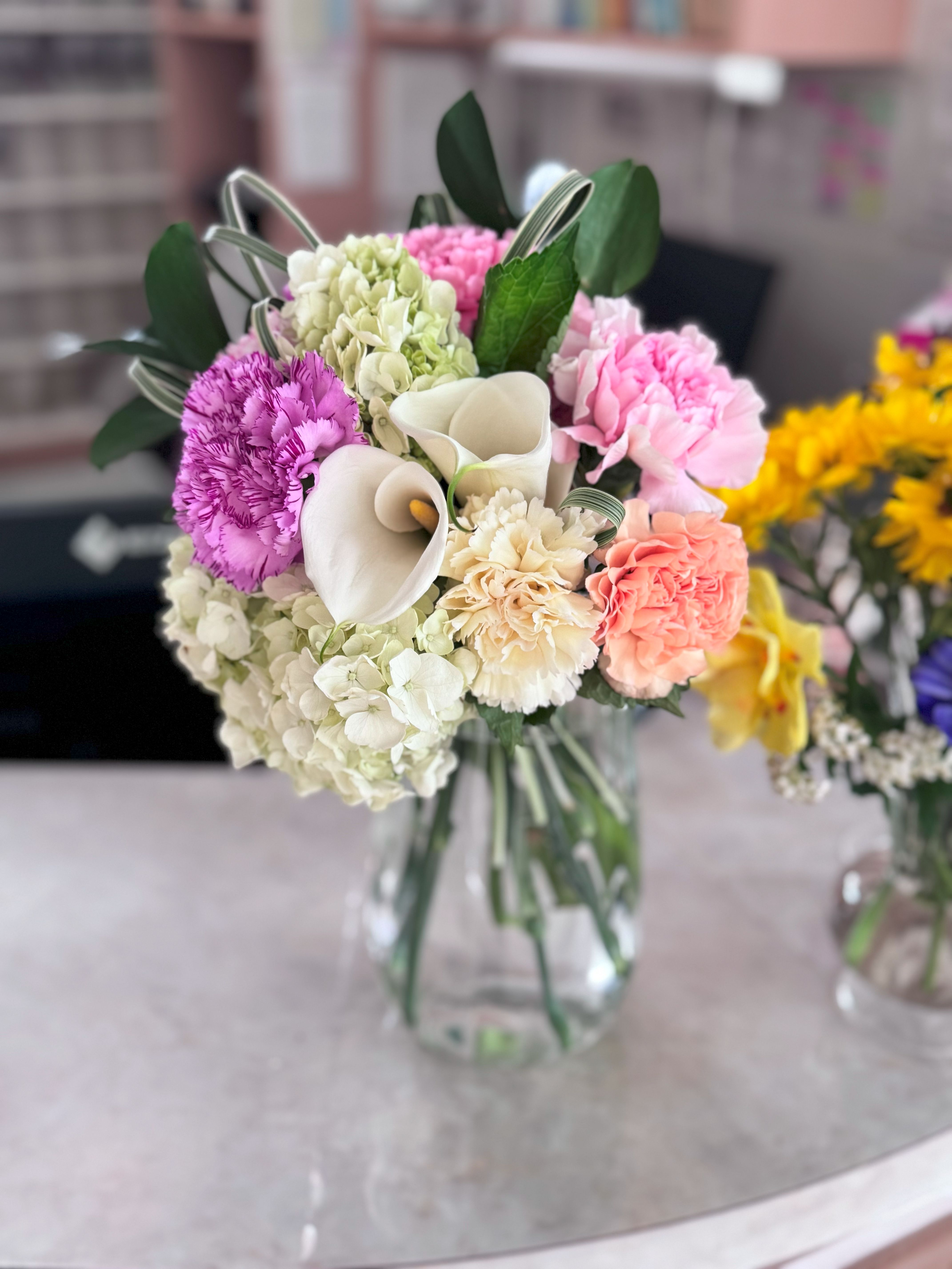 カーネーションとカラーを使った母の日のブーケです