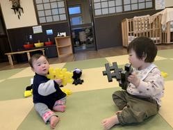 お友達と一緒の玩具を手に取って音を鳴らして楽しんだり、お友達を誘いお人形を抱っこしてお散歩に行くなどごっこ遊びを楽しんでいます。