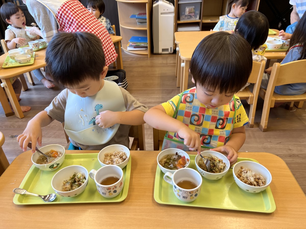 二十五穀玄米ご飯、和風お好み焼き、素麺スープ、ヨーグルト、納豆、ぬか漬けです。